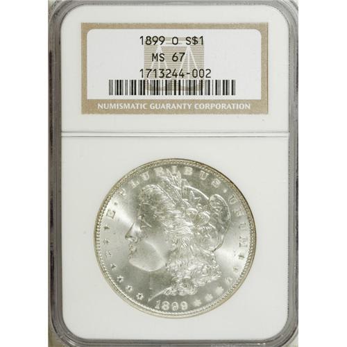 <B>1899-O S$1 MS67 NGC.</B></I> Brilliant surfaces display a satiny luster, and sharply impressed design elements, including sharp definition in the hair around Liberty's ear and on the eagle's breast feathers. Impeccable preservation is apparent throughout. Close to half of the 12 million plus mintage was probably melted (Dave Bowers, 2006). Census: 74 in 67, 0 finer (4/07).<BR><BR><b>Shipping:</b> Coins & Currency (<a target="_blank" href="http://www.heritageauctions.com/common/shipping.php">view shipping information</a>)