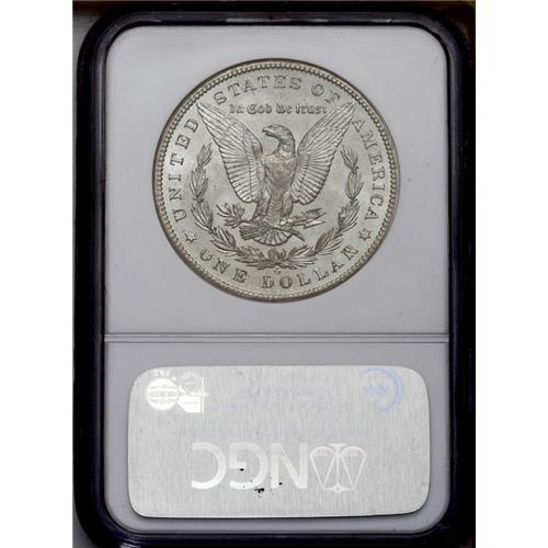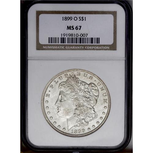<B>1899-O<img border='0' src='http://www.heritagecoins.com/images/star.gif' width=10 height=10>$1> MS67 NGC.</B></I> Exceptionally well struck for a New Orleans Mint product, this lovely Superb Gem exhibits a blazing satiny sheen on both sides, and impeccable surfaces that are essentially untoned. Only the tiniest of pinpoint marks are noted on either side of the coin, even with the aid of a magnifier. A find for the high quality Morgan dollar specialist. Census: 64 in 67, 0 finer (4/06).