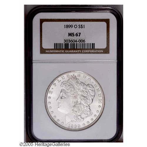 <B>1899-O<S$1> MS67 NGC.</B></I> Sharply struck with amazingly smooth fields and exquisitely preserved surfaces overall that are untoned and have a pleasing satiny sheen. A beautiful Superb Gem, produced by the New Orleans Mint more than a hundred years ago, but still fully lustrous and close to its original condition. Census: 59 in 67, 0 finer (11/05).