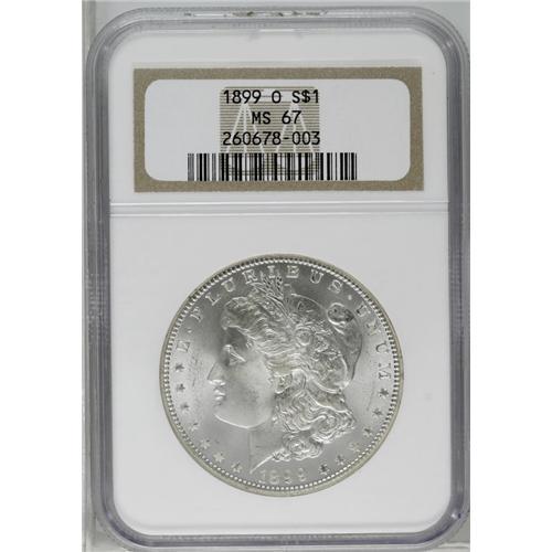 <B>1899-O<img border='0' src='http://www.heritagecoins.com/images/star.gif' width=10 height=10>$1> MS67 NGC.</B></I> With the large numbers of 1899-O dollars released from the Treasury in the early 1960s one would think that this date would be more available than it is in Superb condition. Only 65 pieces have been so graded by NGC (2/06) and only one is finer at either of the major services (a PCGS coin). This is an impressive, satin-surfaced example that is sharply defined and brilliant throughout. There are no obvious or even mentionable abrasions on either side of this impeccably preserved dollar.