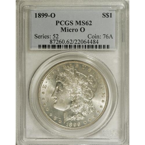 <B>1899-O S$1 Micro O MS62 PCGS.</B></I> VAM-6. A Top 100 Variety. In addition to the diminutive mintmark, the obverse has the Near Date placement with the 1 tilted and close to the truncation. Each side has considerable luster beneath pastel blue and gold patina, and the lightly abraded devices have above-average detail. A fascinating variety, perhaps underrated in Mint State grades; NGC has graded just eight such coins, and PCGS only 12 (2/07).<BR><I>From The Jackson Hole Collection.</B></I><BR><BR><b>Shipping:</b> Coins & Currency (<a target="_blank" href="http://www.heritageauctions.com/common/shipping.php">view shipping information</a>)