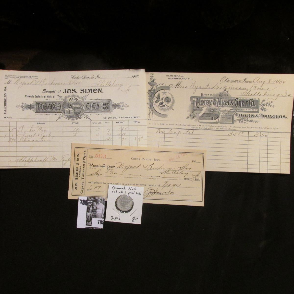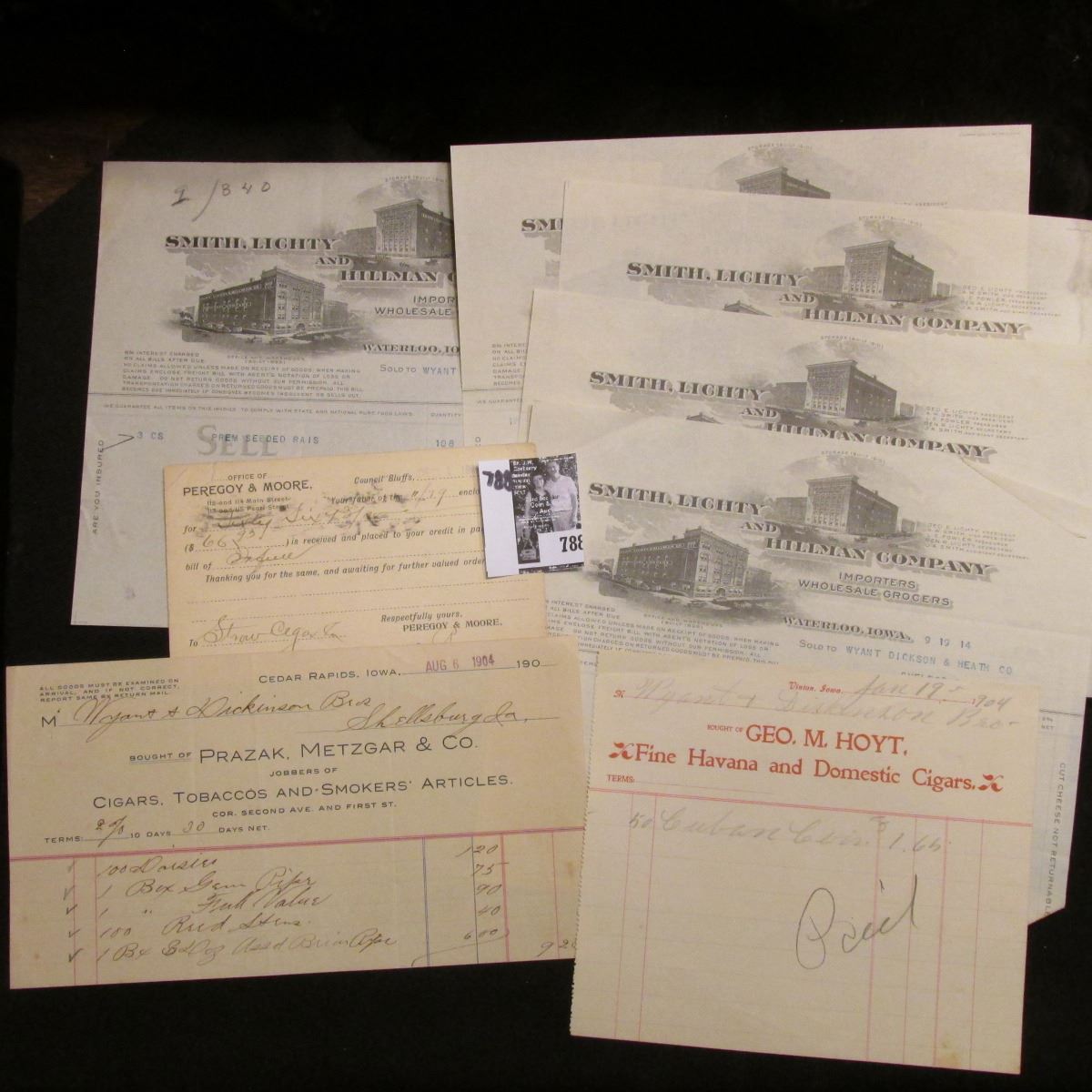 1899 Postcard from "Peregoy & Moore" (Cigar Company); (5) 1914 era invoices from "Smith, Lighty and Hillman Company importers Wholesale Grocers Waterloo, Iowa"; (5) early 1900 era Iowa Cigar Company invoices; (2) packets of Stamp Supplements; & a pair of Thomsen's Pool Hall Tokens.