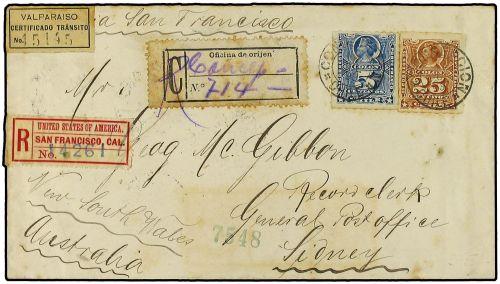 1899 Registered envelope to Sidney, Australia, franked rouletted 5c. + 25c. Colon tied by Concepcion date stamp. Obverse bears Valparaiso & San Francisco transit registration etiquettes. On reverse, New York transit cds. Unusual routing and destination.