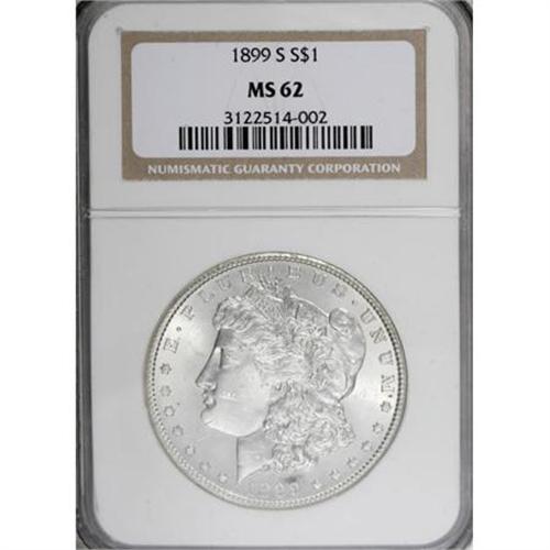 <B>1899-S $1 MS62 NGC.</B></I> NGC Census: (197/1204). PCGS Population (358/2458). Mintage: 2,562,000. Numismedia Wsl. Price for NGC/PCGS coin in MS62: $310. (#7262)<BR><BR><B>Coin Engraver:</B> George T. Morgan<BR><BR><b>Shipping:</b> Coins & Currency (<a target="_blank" href="http://www.heritageauctions.com/common/shipping.php">view shipping information</a>)