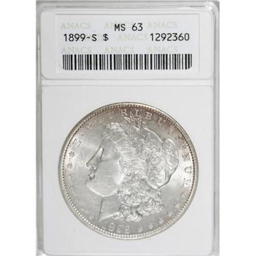 <B>1899-S $1 MS63 ANACS.</B></I> NGC Census: (474/740). PCGS Population (954/1537). Mintage: 2,562,000. Numismedia Wsl. Price for NGC/PCGS coin in MS63: $375. (#7262)<BR><BR><B>Coin Engraver:</B> George T. Morgan<BR><BR><b>Shipping:</b> Coins & Currency (<a target="_blank" href="http://www.heritageauctions.com/common/shipping.php">view shipping information</a>)
