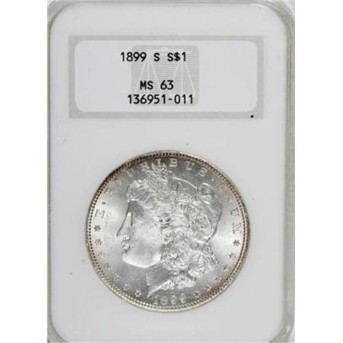 <B>1899-S $1 MS63 NGC.</B></I> NGC Census: (457/736). PCGS Population (943/1483). Mintage: 2,562,000. Numismedia Wsl. Price for NGC/PCGS coin in MS63: $375. (#7262)<BR><BR><B>Coin Engraver:</B> George T. Morgan<BR><BR><b>Shipping:</b> Coins & Currency (<a target="_blank" href="http://www.heritageauctions.com/common/shipping.php">view shipping information</a>)