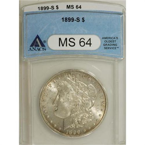 <B>1899-S $1 MS64 ANACS.</B></I> NGC Census: (562/171). PCGS Population (1035/441). Mintage: 2,562,000. Numismedia Wsl. Price for NGC/PCGS coin in MS64: $635. (#7262)<BR><BR><B>Coin Engraver:</B> George T. Morgan<BR><BR><b>Shipping:</b> Coins & Currency (<a target="_blank" href="http://www.heritageauctions.com/common/shipping.php">view shipping information</a>)