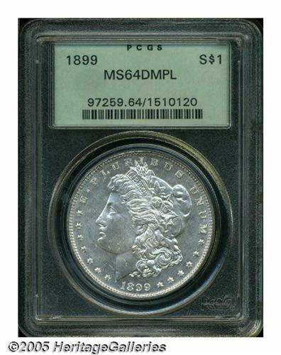 <B>1899<S$1> MS64 Deep Mirror Prooflike PCGS.</B></I> Nicely mirrored fields offer a strong contrast with the sharply struck design elements. A few minor marks are noted on Liberty's face and neck.