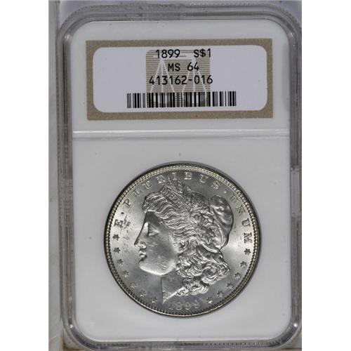 <B>1899<img border='0' src='http://www.heritagecoins.com/images/star.gif' width=10 height=10>$1> MS64 NGC.</B></I> Above average brightness for this date is complemented with an exceedingly sharp strike. Snow-white and fully frosty overall.