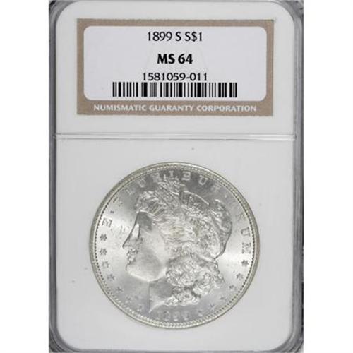 <B>1899-S $1 MS64 NGC.</B></I> NGC Census: (565/171). PCGS Population (1040/443). Mintage: 2,562,000. Numismedia Wsl. Price for NGC/PCGS coin in MS64: $635. (#7262)<BR><BR><B>Coin Engraver:</B> George T. Morgan<BR><BR><b>Shipping:</b> Coins & Currency (<a target="_blank" href="http://www.heritageauctions.com/common/shipping.php">view shipping information</a>)