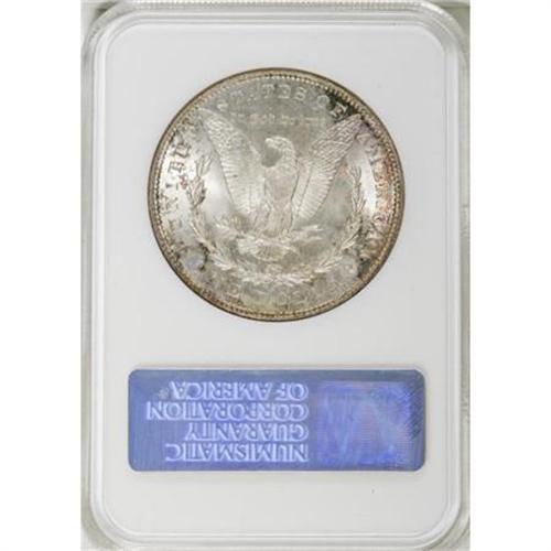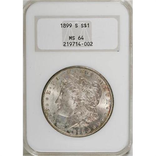 <B>1899-S $1 MS64 NGC.</B></I> Ice-blue, orange, and emerald-green endow this ebulliently lustrous Morgan dollar. The reverse is exquisitely preserved, although the left obverse has faint abrasions. In a prior generation holder.<BR><BR><B>Coin Engraver:</B> George T. Morgan<BR><BR><b>Shipping:</b> Coins & Currency (<a target="_blank" href="http://www.heritageauctions.com/common/shipping.php">view shipping information</a>)