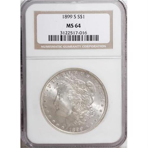 <B>1899-S $1 MS64 NGC.</B></I> NGC Census: (574/165). PCGS Population (1067/451). Mintage: 2,562,000. Numismedia Wsl. Price for NGC/PCGS coin in MS64: $635. (#7262)<BR><BR><B>Coin Engraver:</B> George T. Morgan<BR><BR><b>Shipping:</b> Coins & Currency (<a target="_blank" href="http://www.heritageauctions.com/common/shipping.php">view shipping information</a>)