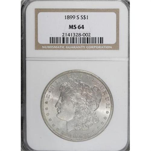 <B>1899-S $1 MS64 NGC.</B></I> . NGC Census: (574/166). PCGS Population (1073/453). Mintage: 2,562,000. Numismedia Wsl. Price for NGC/PCGS coin in MS64: $635. (#7262)<BR><BR><B>Coin Engraver:</B> George T. Morgan<BR><BR><b>Shipping:</b> Coins & Currency (<a target="_blank" href="http://www.heritageauctions.com/common/shipping.php">view shipping information</a>)
