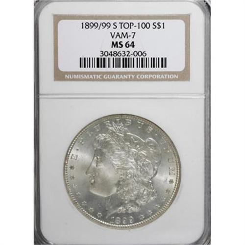 <B>1899/99-S $1 MS64 NGC.</B></I> VAM-7. A Top 100 variety. NGC Census: (575/165). PCGS Population (1078/455). Mintage: 2,562,000. Numismedia Wsl. Price for NGC/PCGS coin in MS64: $635. (#7262)<BR><BR><B>Coin Engraver:</B> George T. Morgan<BR><BR><b>Shipping:</b> Coins & Currency (<a target="_blank" href="http://www.heritageauctions.com/common/shipping.php">view shipping information</a>)