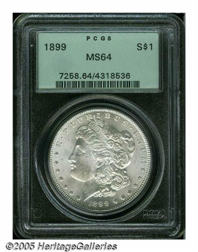 <B>1899<S$1> MS64 PCGS.</B></I> Brilliant surfaces display radiant luster and nicely struck design features, except for a touch of softness in the hair over Liberty's ear. The grade is defined by a few minor marks on Liberty's cheek and neck.