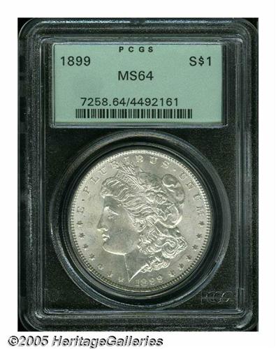<B>1899<S$1> MS64 PCGS.</B></I> The design elements are well struck, though the hair above Liberty's ear is a trifle soft. Nice luster emanates from the silver-gray surfaces that exhibit just a touch of light tan color in localized areas. Some minute grade-defining marks are seen on Liberty's cheek and neck.