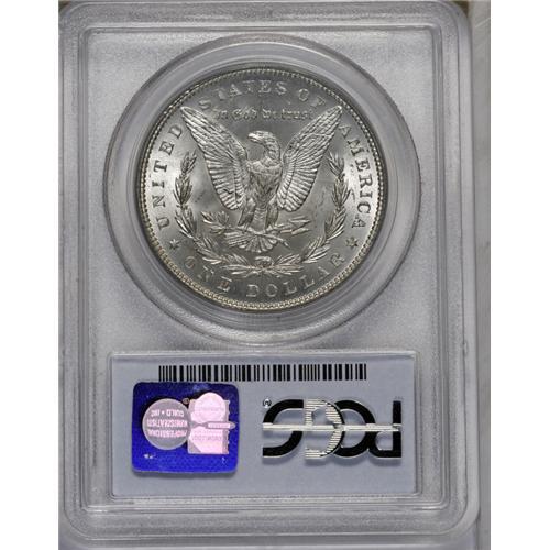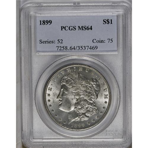 <B>1899<img border='0' src='http://www.heritagecoins.com/images/star.gif' width=10 height=10>$1> MS64 PCGS.</B></I> Well defined and completely untoned with slightly subdued luster. A lateral scratch across the eagle's breast and a small abrasion on the left (facing) wing serve to limit the grade.