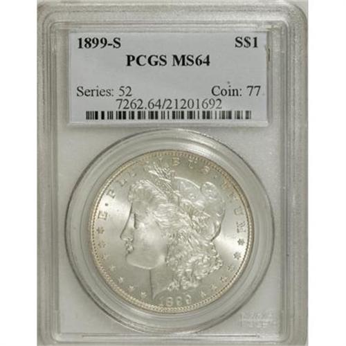 <B>1899-S $1 MS64 PCGS.</B></I> PCGS Population (1040/443). NGC Census: (565/171). Mintage: 2,562,000. Numismedia Wsl. Price for NGC/PCGS coin in MS64: $635. (#7262)<BR><BR><B>Coin Engraver:</B> George T. Morgan<BR><BR><b>Shipping:</b> Coins & Currency (<a target="_blank" href="http://www.heritageauctions.com/common/shipping.php">view shipping information</a>)