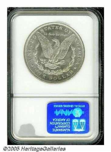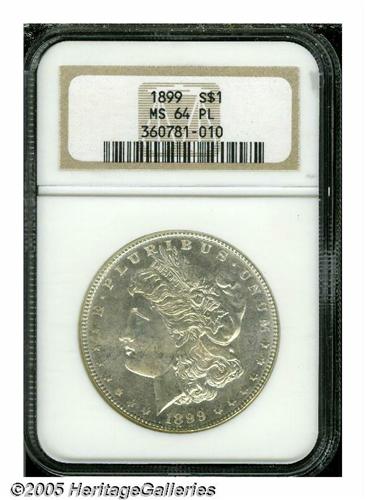 <B>1899<S$1> MS64 Prooflike NGC.</B></I> The design elements are well struck, except for softness in the hair over Liberty's ear. The bright surfaces display a whisper of light tan color on Liberty's cheek, and a few minute marks on Liberty's cheek. Population: 65 in 64, 19 finer (3/05).