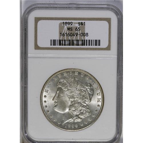 <B>1899<img border='0' src='http://www.heritagecoins.com/images/star.gif' width=10 height=10>$1> MS65 NGC.</B></I> A boldly struck and gently toned Gem kept from a finer grade by a hint of reverse carbon. The 1899 is among the lowest mintage Philadelphia dates.