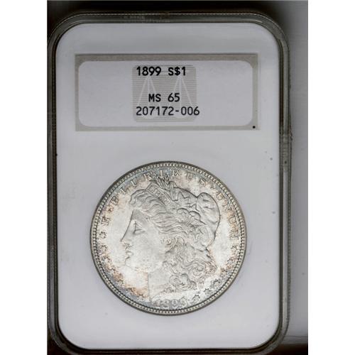 <B>1899<img border='0' src='http://www.heritagecoins.com/images/star.gif' width=10 height=10>$1 MS65 NGC.</B></I> Satiny and free of substantial marks, particularly on the reverse, which is virtually pristine. Both sides are well struck and display speckled olive, cobalt-blue, and russet peripheral toning. An attractive Gem dollar. Census: 445 in 65, 52 finer (12/05).