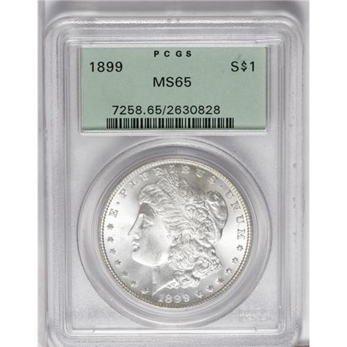 <B>1899<img border='0' src='http://www.heritagecoins.com/images/star.gif' width=10 height=10>$1> MS65 PCGS.</B></I> A premium quality example for the grade with a clean cheek, unimpeded fields, and dynamic design detailing on both sides. Entombed in an older green PCGS holder.