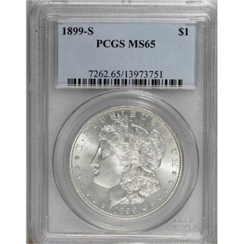 <B>1899-S $1 MS65 PCGS.</B></I> Well struck and shining, a lovely Gem example of this popular late 19th century issue. Aside from a touch of haze in the left obverse field, hardly any patina is present on the surfaces of this pleasing S-mint.<BR><BR><B>Coin Engraver:</B> George T. Morgan<BR><BR><b>Shipping:</b> Coins & Currency (<a target="_blank" href="http://www.heritageauctions.com/common/shipping.php">view shipping information</a>)