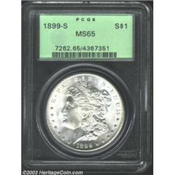 <TR><TD width="100%"><TABLE cellSpacing=1 cellPadding=3 width="100%" border=0><TBODY><TR><TD width="100%" bgColor=#79735c><FONT face=arial color=#ffffff size=3><B>Description</B> </FONT></TD></TR><TR><TD width="100%" bgColor=#ffffff><FONT face=arial size=2><B>1899-S $1 MS65 PCGS.</B></I> Well struck with flashy luster and light gold color in the centers. The cheek and fields are lovingly preserved. A small contact mark on the reverse rim at 3 o'clock is barely worthy of mention. The mintmark leans heavily to the right. </FONT></TD></TR></TBODY></TABLE></TD></TR></TBODY></TABLE><BR><A name=PricesRealized></A><TABLE cellSpacing=0 cellPadding=0 width="100%" bgColor=#000000 border=0><TBODY><TR><TD width="100%"><TABLE cellSpacing=1 cellPadding=3 width="100%" border=0><TBODY><TR><TD width="100%" bgColor=#79735c><A name=PR><FONT face=arial color=#ffffff size=3><B>Previous Prices from Heritage Auctions</B> </FONT></A></TD></TR><TR><TD bgColor=#f6f6ed><TABLE cellSpacing=0 cellPadding=0 width="100%" border=1><TBODY><TR><TD align=middle width="33%"><B>Date</B></TD><TD align=middle width="33%"><B>Service</B></TD><TD align=middle width="33%"><B>Price</B></TD></TR><TR bgColor=whitesmoke><TD width="33%"><B>01/21/2003</B></TD><TD width="33%">PCGS</TD><TD width="33%">$1,437.50</TD></TR><TR bgColor=whitesmoke><TD width="33%"><B>01/11/2003</B></TD><TD width="33%">PCGS</TD><TD width="33%">$1,207.50</TD></TR><TR bgColor=whitesmoke><TD width="33%"><B>01/11/2003</B></TD><TD width="33%">PCGS</TD><TD width="33%">$1,380.00</TD></TR><TR bgColor=whitesmoke><TD width="33%"><B>09/28/2002</B></TD><TD width="33%">PCGS</TD><TD width="33%">$1,610.00</TD></TR><TR bgColor=whitesmoke><TD width="33%"><B>07/30/2002</B></TD><TD width="33%">PCGS</TD><TD width="33%">$1,610.00</TD></TR><TR bgColor=whitesmoke><TD width="33%"><B>04/27/2002</B></TD><TD width="33%">PCGS</TD><TD width="33%">$1,725.00</TD></TR><TR bgColor=whitesmoke><TD width="33%"><B>02/23/2002</B></TD><TD width="33%">PCGS</TD><TD width="33%">$1,495.00</TD></TR><TR bgColor=whitesmoke><TD width="33%"><B>06/04/1999</B></TD><TD width="33%">PCGS</TD><TD width="33%">$1,610.00</TD></TR><TR bgColor=whitesmoke><TD width="33%"><B>04/30/1993</B></TD><TD width="33%">PCGS</TD><TD width="33%">$1,320.00</TD></TR><TR bgColor=whitesmoke><TD width="33%"><B>06/01/1996</B></TD><TD width="33%">PCGS</TD><TD width="33%">$1,045.00</TD></TR><TR bgColor=whitesmoke><TD width="33%"><B>11/12/1993</B></TD><TD width="33%">PCGS</TD><TD width="33%">$880.00</TD></TR><TR bgColor=whitesmoke><TD width="33%"><B>03/14/1999</B></TD><TD width="33%">PCGS</TD><TD width="33%">$1,457.50</TD></TR><TR bgColor=whitesmoke><TD width="33%"><B>05/01/1996</B></TD><TD width="33%">PCGS</TD><TD width="33%">$1,100.00</TD></TR><TR bgColor=whitesmoke><TD width="33%"><B>11/01/1999</B></TD><TD width="33%">PCGS</TD><TD width="33%">$935.00</TD></TR><TR bgColor=whitesmoke><TD width="33%"><B>04/05/2001</B></TD><TD width="33%">PCGS</TD><TD width="33%">$1,207.50</TD></TR><TR bgColor=whitesmoke><TD width="33%"><B>01/05/2001</B></TD><TD width="33%">PCGS</TD><TD width="33%">$1,725.00</TD></TR><TR bgColor=whitesmoke><TD width="33%"><B>02/01/1999</B></TD><TD width="33%">PCGS</TD><TD width="33%">$1,595.00</TD></TR><TR bgColor=whitesmoke><TD width="33%"><B>03/14/1996</B></TD><TD width="33%">PCGS</TD><TD width="33%">$907.50</TD></TR><TR bgColor=whitesmoke><TD width="33%"><B>11/12/1993</B></TD><TD width="33%">PCGS</TD><TD width="33%">$880.00</TD></TR><TR bgColor=whitesmoke><TD width="33%"><B>11/15/2001</B></TD><TD width="33%">PCGS</TD><TD width="33%">$1,035.00</TD></TR><TR bgColor=whitesmoke><TD width="33%"><B>01/28/2003</B></TD><TD width="33%">NGC</TD><TD width="33%">$1,357.00</TD></TR><TR bgColor=whitesmoke><TD width="33%"><B>11/23/2002</B></TD><TD width="33%">NGC</TD><TD width="33%">$1,092.50</TD></TR><TR bgColor=whitesmoke><TD width="33%"><B>06/08/2002</B></TD><TD width="33%">NGC</TD><TD width="33%">$1,207.50</TD></TR><TR bgColor=whitesmoke><TD width="33%"><B>10/06/2001</B></TD><TD width="33%">NGC</TD><TD width="33%">$977.50</TD></TR><TR bgColor=whitesmoke><TD width="33%"><B>05/22/2001</B></TD><TD width="33%">NGC</TD><TD width="33%">$1,350.00</TD></TR><TR bgColor=whitesmoke><TD width="33%"><B>03/13/1999</B></TD><TD width="33%">NGC</TD><TD width="33%">$1,207.50</TD></TR><TR bgColor=whitesmoke><TD width="33%"><B>11/15/2001</B></TD><TD width="33%">NGC</TD><TD width="33%">$1,380.00</TD></TR><TR bgColor=whitesmoke><TD width="33%"><B>08/28/2001</B></TD><TD width="33%">ANACS</TD><TD width="33%">$975.00</TD></TR></TBODY></TABLE></TD></TR><TR><TD bgColor=#ffffff><FONT face=arial size=1 ?>PLEASE NOTE: All prices realized reflect the final hammer price PLUS the buyer's premium in auctions that charge a buyer's premium. Each item has a notation at the top of the listing indicating whether that lot included a buyer's premium. Example: A item that sells with a final hammer price of $100 and a 20% buyer's premium will display with a price realized of $120. All information listed is intended to be as accurate as possible, but errors are possible. Please use this guide carefully and inform us of any inaccuracies. </FONT></TD></TR></TBODY></TABLE></TD></TR></TBODY></TABLE><BR><TABLE cellSpacing=0 cellPadding=0 width="100%" bgColor=#000000 border=0><TBODY><TR><TD width="100%"><TABLE cellSpacing=1 cellPadding=3 width="100%" border=0><TBODY><TR><TD width="100%" bgColor=#79735c colSpan=6><FONT face=arial color=#ffffff size=3><B>Price Guide*</B> </FONT></TD></TR><TR bgColor=#f6f6ed><TD align=middle><B>Grade</B> </TD><TD align=middle><B>Coin World<BR>(Trends)</B> </TD><TD align=middle><B>Numismedia<BR>Retail</B> </TD><TD align=middle><B>Numismedia<BR>Wholesale</B> </TD><TD align=middle><B>Coin<BR>Universe</B> </TD><TD align=middle><B>Heritage<BR>Value Index</B> </TD></TR><TR bgColor=#ffffff><TD align=middle>64</TD><TD align=right>$500.00</TD><TD align=right>$550.00</TD><TD align=right>$440.00</TD><TD align=right>$550.00</TD><TD align=right>$440.00</TD></TR><TR 