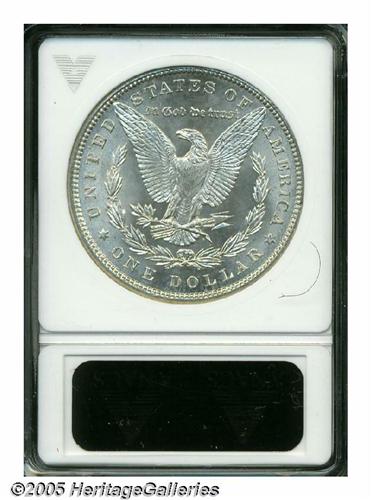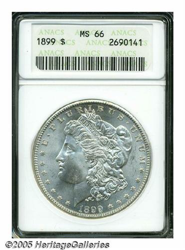<B>1899<S$1> MS66 ANACS.</B></I> A splendid, immaculate Gem example that exhibits frosty devices and satiny fields. Certain to delight even the most demanding Morgan dollar enthusiast. From a tiny original mintage (by Morgan dollar standards) of just 330,846 pieces.