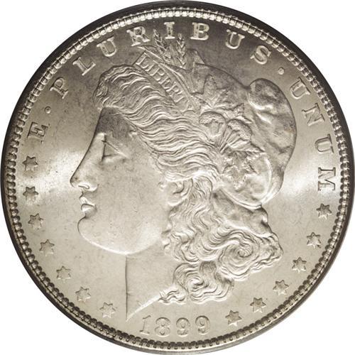<B>1899<img border='0' src='http://www.heritagecoins.com/images/star.gif' width=10 height=10>$1> MS66 PCGS.</B></I> Ex: NFL Set. Although produced in limited numbers, the 1899 is a relatively obtainable coin in Mint State. We do, however, stress that the previous statement is only valid for examples at the MS60-65 grade levels. In MS66, the 1899 is a scarce issue, and few coins have been certified any finer. Well struck with a swirling, frosty sheen, both sides are free of even the most trivial distraction. Delicate silver-gray iridescence is noted throughout. Population: 153 in 66, only 16 are finer (7/06).