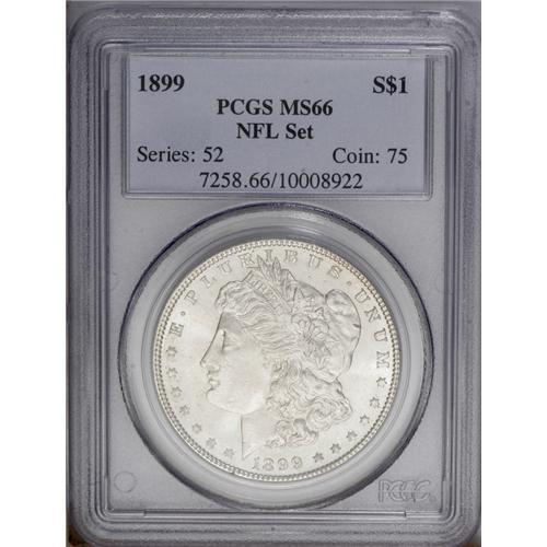 <B>1899<img border='0' src='http://www.heritagecoins.com/images/star.gif' width=10 height=10>$1> MS66 PCGS.</B></I> NFL Set. This coin was previously offered as lot 7982 in our January 2001 FUN Signature Sale, where it was described as: "Although produced in limited numbers, the 1899 is a relatively obtainable coin in Mint State. We do, however, stress that the previous statement is only valid for examples at the MS60-65 grade levels. In MS66, the 1899 is a scarce issue, and few coins have been certified any finer. Well struck with a swirling, frosty sheen, both sides are free of even the most trivial distraction. Delicate silver-gray iridescence is noted throughout."<BR><I>From The Michael Casper Collection, Part Three.</B></I>