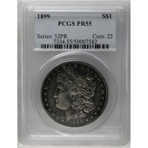 <B>1899<img border='0' src='http://www.heritagecoins.com/images/star.gif' width=10 height=10>$1> PR55 PCGS.</B></I> A lightly circulated proof with slight wear on the high points of each side. The surfaces are grayish-lilac with deeper toning near the borders.