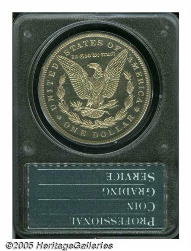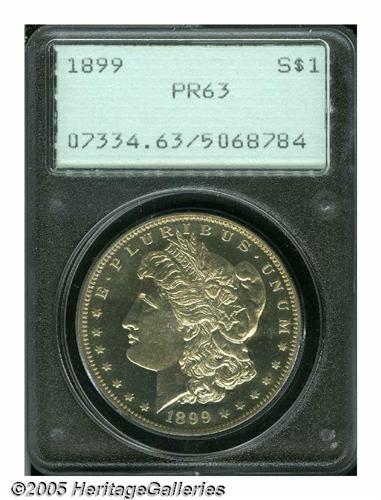 <B>1899<S$1> PR63 PCGS.</B></I> The lightly frosted alabaster-gold devices seem to float above watery dark-green fields. The striking details are flawless throughout, and the piece only has faint hairlines, on each side, to explain the PR63 grade designation. In a first-generation PCGS holder.<BR><I>From The Dr. John L. Pellegrini Collection.</B></I>