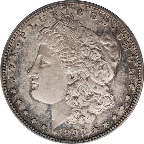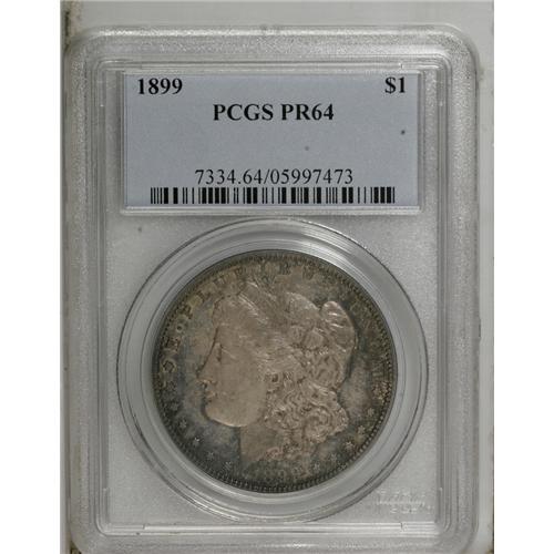 <B>1899 S$1 PR64 PCGS.</B></I> Antique gold color predominates on this proof dollar, with rose and deep gray completing the palette in the peripheries. The fields are fully reflective and show an attractive indigo-russet toning pattern if held up to a light just so. Lightly abraded, as appropriate for the grade, and sharply detailed.<BR><BR><b>Shipping:</b> Coin/Currency (<a target="_blank" href="http://www.heritageauctions.com/common/shipping.php">view shipping information</a>)