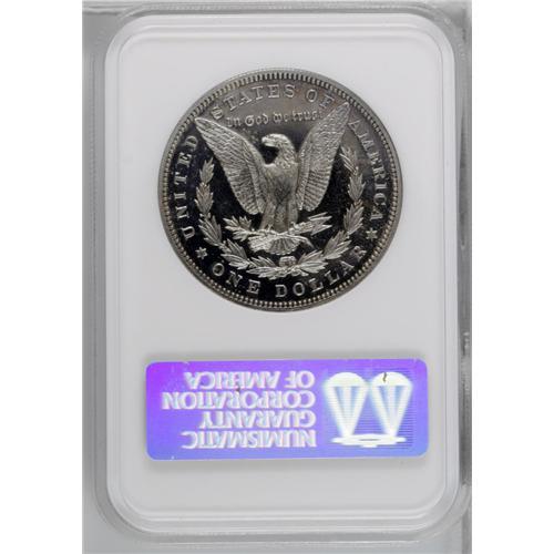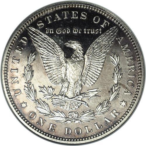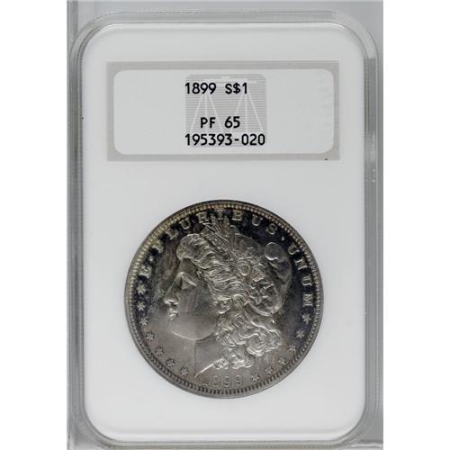 <B>1899<img border='0' src='http://www.heritagecoins.com/images/star.gif' width=10 height=10>$1> PR65 NGC.</B></I> The fields on both sides are deeply mirrored with slightly hazy toning visible mostly on the obverse. This is essentially a brilliant proof with little cameo contrast; some die finishing lines are visible on the devices, especially on the lower part of the cheek and upper portion of the neck on the obverse. Just 846 proofs were struck during the year. In addition, the business strike mintage was limited, making this an important opportunity for collectors. <BR><BR><B>Importa