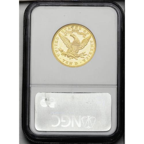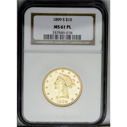 <B>1899-S<$10> MS61 Prooflike NGC.</B></I> This well struck Prooflike Liberty eagle has its share of small abrasions, but the flashy fields and occasional cameo contrast ensure reasonable eye appeal. Census: 2 in 61 Prooflike, 3 finer (3/06).
