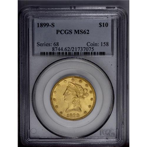 <B>1899-S $10 MS62 PCGS.</B></I> A satiny apricot-gold eagle with smooth, subdued surfaces. Boldly struck except for a couple of left side stars.