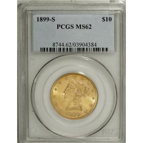 <B>1899-S $10 MS62 PCGS.</B></I> The 1899-S is a bit scarcer in Mint State than expected from its mintage. Presumably, much of the production entered commerce. The present piece is impressive for its designated grade, since it is lustrous, well struck, and only lightly abraded.<BR><BR><B>Coin Engraver:</B> Christian Gobrecht<BR><BR><b>Shipping:</b> Coins & Currency (<a target="_blank" href="http://www.heritageauctions.com/common/shipping.php">view shipping information</a>\)