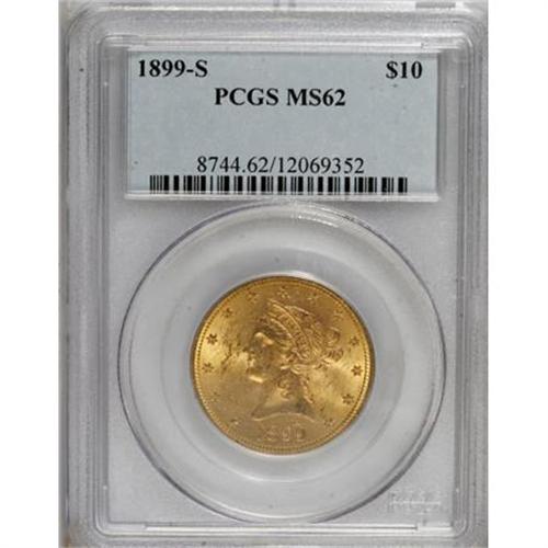 <B>1899-S $10 MS62 PCGS.</B></I> PCGS Population (102/64). NGC Census: (98/44). Mintage: 841,000. Numismedia Wsl. Price for NGC/PCGS coin in MS62: $395. (#8744)<BR><BR><B>Coin Engraver:</B> Christian Gobrecht<BR><BR><b>Shipping:</b> Coins & Currency (<a target="_blank" href="http://www.heritageauctions.com/common/shipping.php">view shipping information</a>)