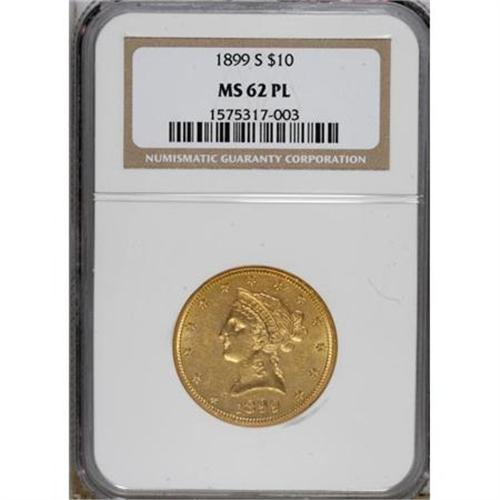 <B>1899-S $10 MS62 Prooflike NGC.</B></I> This reflective yellow-gold eagle features a precise strike and moderately abraded fields. NGC has certified only five pieces as Prooflike. Census: 2 in 62 Prooflike, 0 finer (5/07).<BR><BR><b>Shipping:</b> Coins & Currency (<a target="_blank" href="http://www.heritageauctions.com/common/shipping.php">view shipping information</a>)