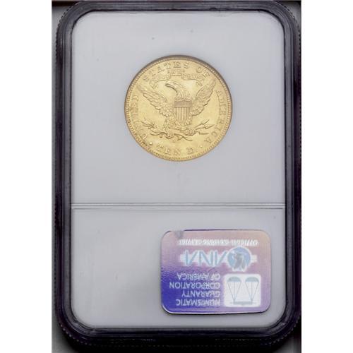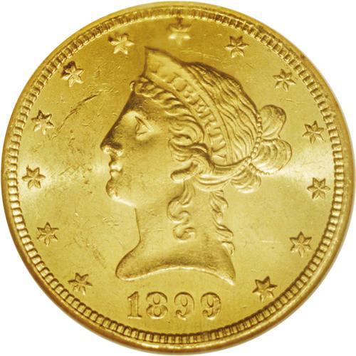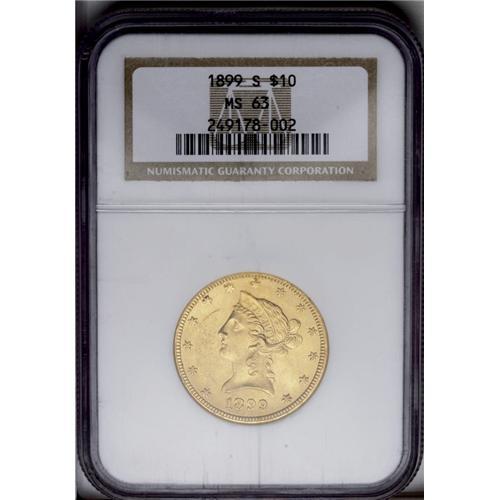 <B>1899-S<$10> MS63 NGC.</B></I> A frosty coin that retains ample luster and a decent strike for the issue. The surfaces show some scattered handling marks as expected for the grade. One thin scrape will serve to identify this coin, which is found in the field above Liberty's forehead. <BR><BR><B>Important notice:</B> Heritage usually auctions material at the rate of 200-250 lots per hour. On some occasions eBay Live bid software or the Internet may not be able to keep up with the pace of the auction. We recommend placing a realistic absentee bid now as insurance to avoid disappointment. Occasionally the auctioneer may eliminate or reject an eBay Live bid, and the auctioneer may also reopen a lot after the close of the eBay live bidding (usually because we missed an audience bid), and may reject your bid even if it shows you as the winning bidder. By bidding via eBay Live, you agree that Heritage may award the lot to another bidder at its sole discretion under the circumstances described above or any other reasonable circumstances. Since eBay bids are not shown to us until we open the lot on the floor, we treat those bids just like floor bids. In most cases the floor responds before the eBay bid is presented to us, due to Internet lag time, so for consistency we have made it a policy that floor bids are always considered first over tie eBay live bids. Also please note that all Heritage lots purchased through eBay Live carry a 20% Buyer's Premium. Please make sure you read the Terms and Conditions before you bid. This lot is being auctioned in conjunction with a live floor auction by Heritage Galleries & Auctioneers. All final auction and invoice information will be supplied by Heritage Galleries & Auctioneers, and all other information should be considered preliminary. Lot:4059 <BR><BR><B>Winning Notification and Billing:</B> After the FINAL session in this auction is complete, Heritage will send e-mail and snail mail invoices. This process normally takes several days. All final auction and invoice information will be supplied by Heritage Galleries & Auctioneers, and all other information should be considered preliminary. <BR><BR>This auction will be conducted on a live auction floor and over the Internet through eBay Live. If you choose to place an absentee bid, please take a moment to <font color='#0000ff'><u><a href='http://pages.ebay.com/liveauctions/help/before/laabsentee.html'>learn how eBay Live absentee bidding works</a></u></font><font color='#000000'>