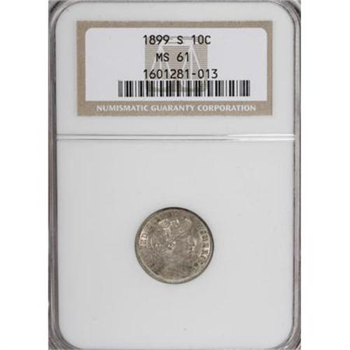 <B>1899-S 10C MS61 NGC.</B></I> NGC Census: (8/50). PCGS Population (3/71). Mintage: 1,867,493. Numismedia Wsl. Price for NGC/PCGS coin in MS61: $292. (#4820)<BR><BR><B>Coin Engraver:</B> Charles E. Barber<BR><BR><b>Shipping:</b> Coins & Currency (<a target="_blank" href="http://www.heritageauctions.com/common/shipping.php">view shipping information</a>)