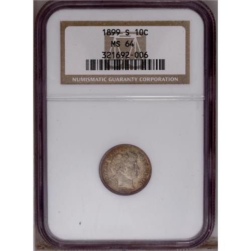 <B>1899-S<10C> MS64 NGC.</B></I> Lovely reddish-golden peripheral patina is contrasted with gray-green over the central regions. A lustrous and well struck near-Gem with attractive surfaces. The mintmark is strike doubled. Less than 1.9 million pieces were struck, a much lower mintage than Philadelphia Mint issues of the era. Census: 11 in 64, 9 finer (1/06).
