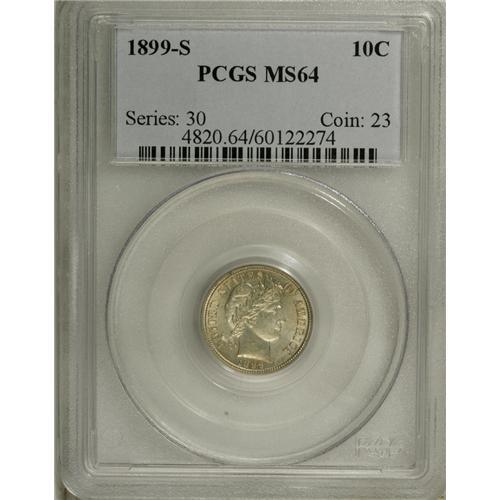 <B>1899-S 10C MS64 PCGS.</B></I> A lustrous golden-tan near-Gem, sharply struck and attractive despite a few trivial slide marks. The obverse die is in a late state and has slender cracks and a moderate orange-peel texture. Minor repunching is noted at the date. Population: 23 in 64, 16 finer (12/06).<BR><BR><b>Shipping:</b> Coin/Currency (<a target="_blank" href="http://www.heritageauctions.com/common/shipping.php">view shipping information</a>)