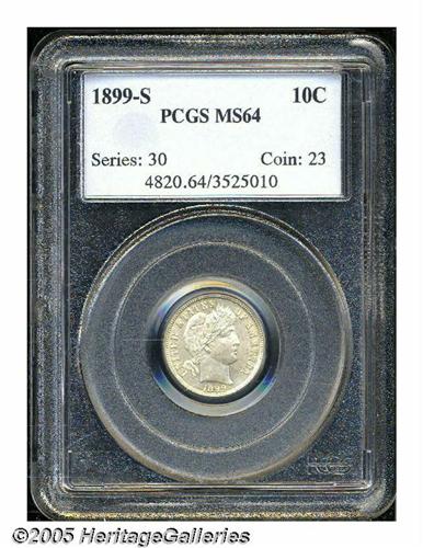 <B>1899-S<10C> MS64 PCGS.</B></I> Light golden-yellow tonality and lustrous. A couple of minute contact marks, including on Liberty's neck and another pair near the bow on the wreath, preclude a full Gem designation.