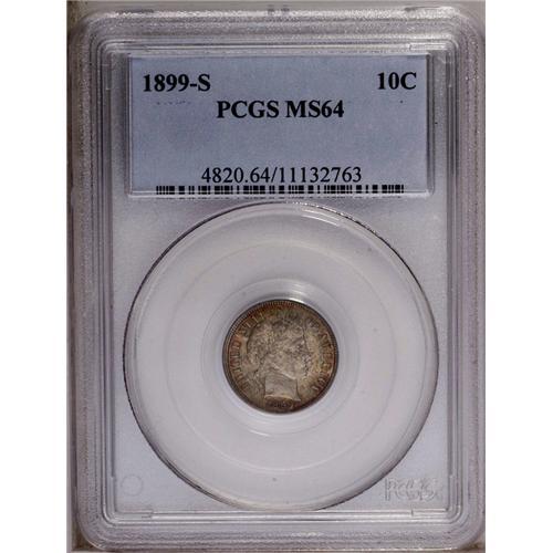 <B>1899-S<10C> MS64 PCGS.</B></I> Well struck with enticing sea-green, gold, and red-russet patina and minimally marked surfaces for the grade. Relatively available in lower grades, the '99-S is very scarce in Choice and finer condition. Population: 24 in 64, 15 finer (4/06).