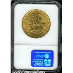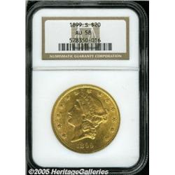<B>1899-S $20 AU58 NGC.</B></I> This lightly circulated S-mint features attractive honey-gold surfaces that still retain considerable luster. A few light to moderate marks are scattered over each side, but none are singularly offensive.