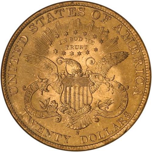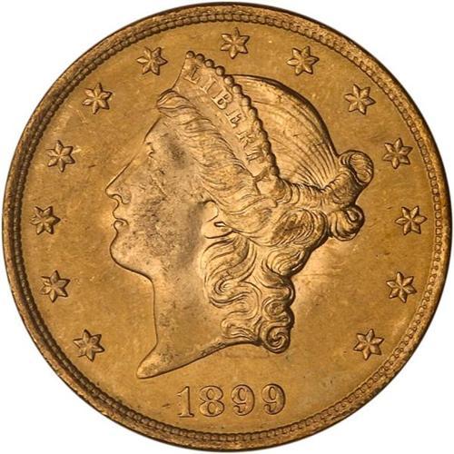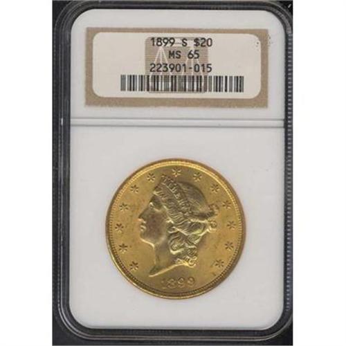 <b>1899-S $20 Liberty. NGC graded MS65.</b> A satiny gem of the most advantageous order for a $20 gold coin collector. Its high degree of broad-spinning cartwheel luster pulses beneath rich gold and pale peach highlights. Nicely struck, too, with just a small amount of weakness at the usual Achilles' heel on the upper rim dentils above Liberty (scarcely worth mentioning) <b>(PCGS # 9036)</b> <i>