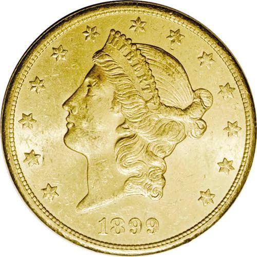 1899-S $20 MS61 NGC. A radiant honey-gold turn of the 1899-S[$20] MS61 NGC.