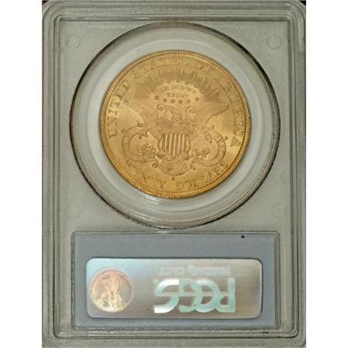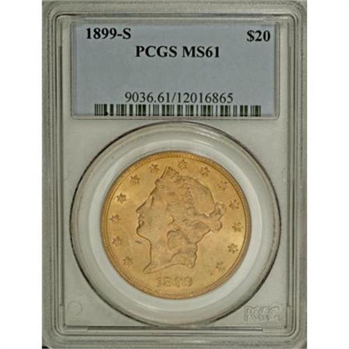 <B>1899-S $20 MS61 PCGS.</B></I> Thick and satiny luster drapes each side, awash in rich orange-gold color. There are fewer abrasions than usually seen, but those present are somewhat prominent, including some marks on and around Liberty's jaw.<BR><I>From The York/Hallenbeck #2 Current Finest PCGS Registry Set of Liberty Double Eagles.</B></I><BR><BR><B>Coin Engraver:</B> James B. Longacre<BR><BR><b>Shipping:</b> Coins & Currency (<a target="_blank" href="http://www.heritageauctions.com/common/shipping.php">view shipping information</a>)